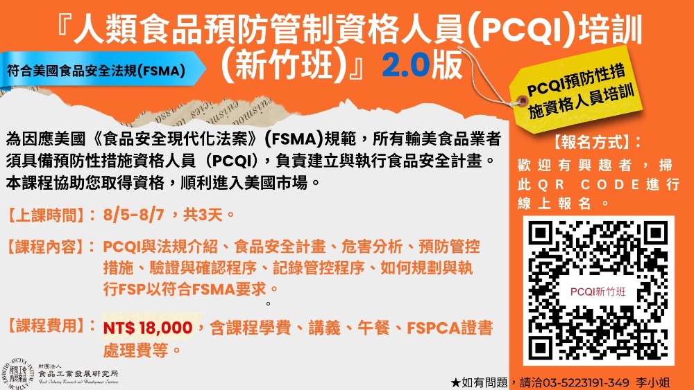 課程訊息: 【開班日期】:2025-12-09~2025-12-12。 (本所保有調整課程內容之權利,實際開班時間請以實際上課通知函為準。) 【上課地點】:食品工業發展研究所訓練班教室 (新竹市食品路331號) 【培訓對象】:衛管、品管、生管等技術人員。 【課程內容】: 1.廠房規畫與管理 2.食品工廠水質處理 3.機械設備衛生設計與管理重點說明 4.過敏原管控 5.人員衛生管理 6.廠房與設備清潔效果評估實務(含有效清洗與消毒方案)1 7.廠房與設備清潔效果評估實務(含有效清洗與消毒方案)2 8.有效病媒防治計畫 9.化學品管理 【課程費用】:NT$ 10,000 (含課程學費、講義、午餐),前項費用以電匯支付之手續費用由學員負擔。 【洽詢電話】:03-5223191分機,720黃先生。 【報名連結】:https://mms.firdi.org.tw/product/detail/T114A02001115 【繳費方式】:請收到上課及繳費通知後,請於繳費期限內完成繳費。如有任何繳費問題,請洽詢承辦人。 【發票開立】:繳費完成即開立發票,請正確填寫發票資訊。發票一旦開立,恕不提供更換發票之服務,敬請見諒。 【退費標準】:開課四日前來電取消課程者,退還所繳費用全額;開課前一~三日取消者,退還所繳費用之七成;開課後即不退費。 【貼心提醒】: