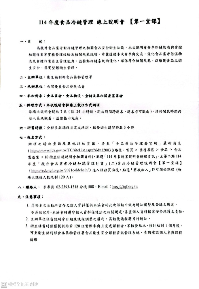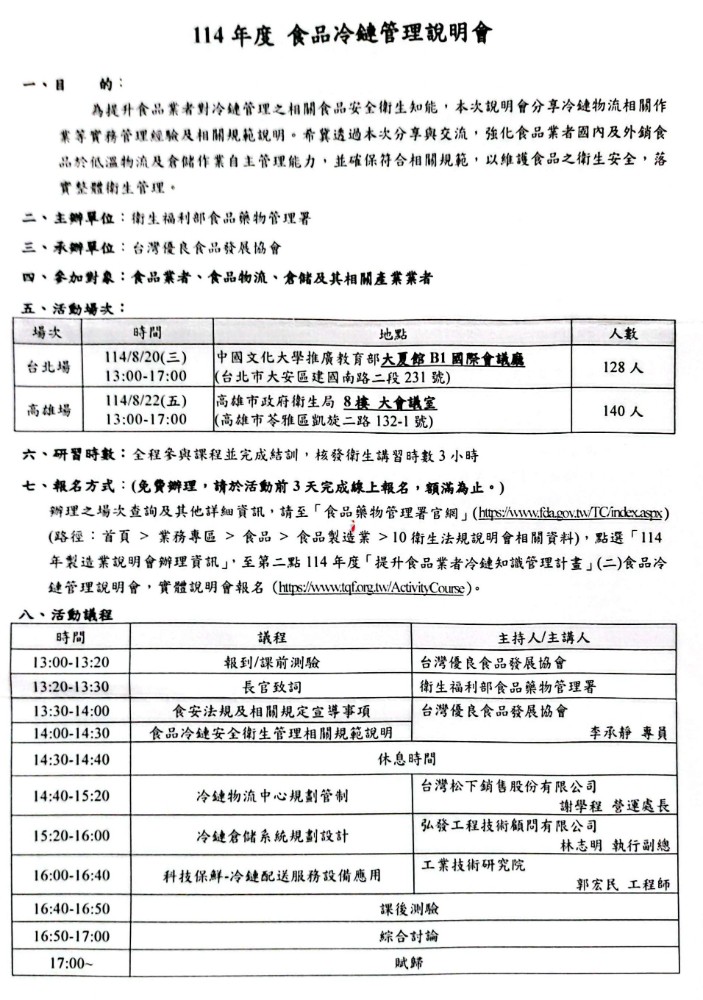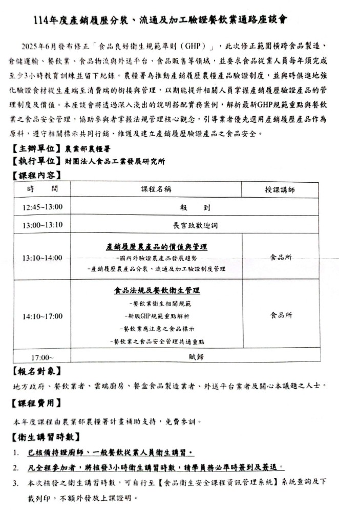 報名資訊 【線上報名】:https://mms.firdi.org.tw/product/detail/T114E01001220 【對象】:食品產業鏈企業負責人或企業員工。 【費用】:4000/人 (含學費、午餐及教材) 【貼心提醒】: