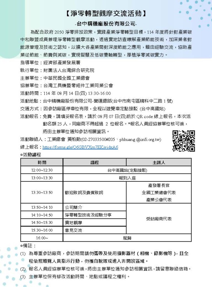 配合政府2050淨零排放政策,實踐產業淨零轉型目標,本會特舉辦「淨零轉型觀摩交流活動」,藉由減碳標竿企業之實地觀摩交流,分享企業在淨零轉型過程的創新實踐、成功經驗以及遇到的挑戰,擴大跨產業間減碳技術的應用與學習,加速產業淨零步伐,厚植產業減碳實力。