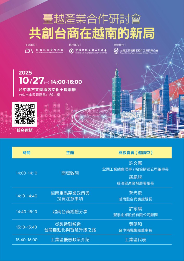 也聚焦到眾所矚目的越南,期透過產官學界深度對話與業界實務經驗分享,探討我商於越南投資佈局、製造轉型與供應鏈韌性等核心議題,敬邀 鈞長出席本次盛會。